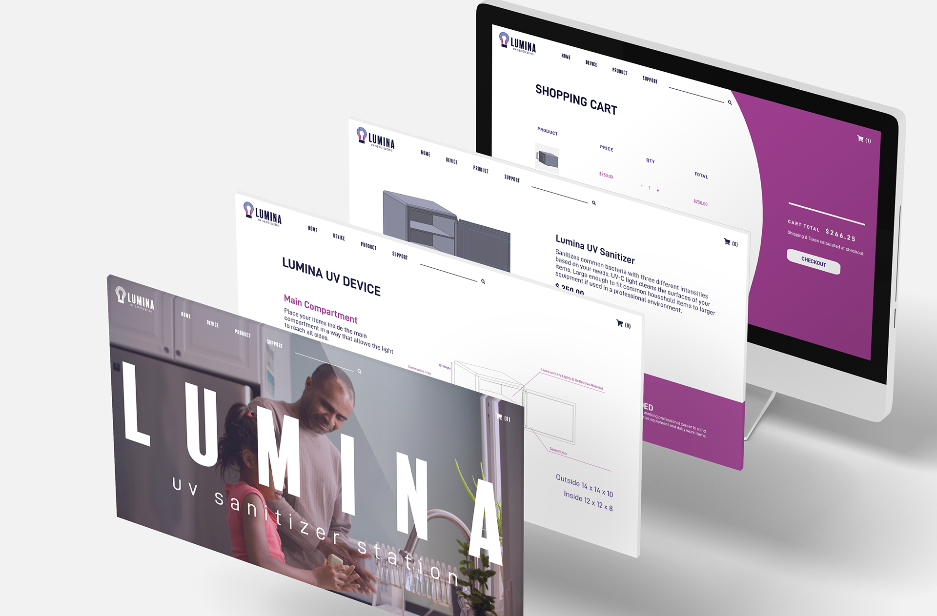 The LUMINA app and website accompanying a UV sanitizing device to fight bacteria and contagions.